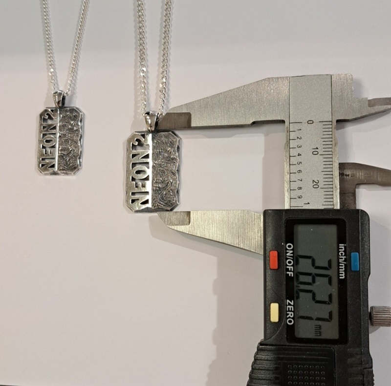 NEON2 Pieninä palasina laattakaulakoru, isomman laatan leveys n.17,7mm, korkeus n. 26,6mm, hopeaa, kotimaista työtä – Kirsi Helminen Design. Voit valita isompaan laattakoruun 50cm, 55cm tai 60cm hopeaketjun.