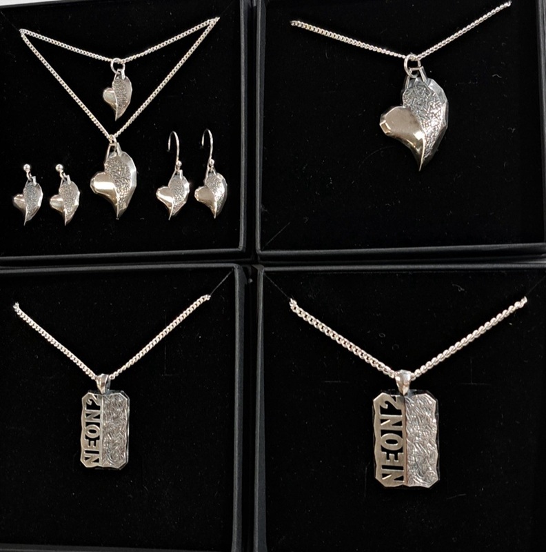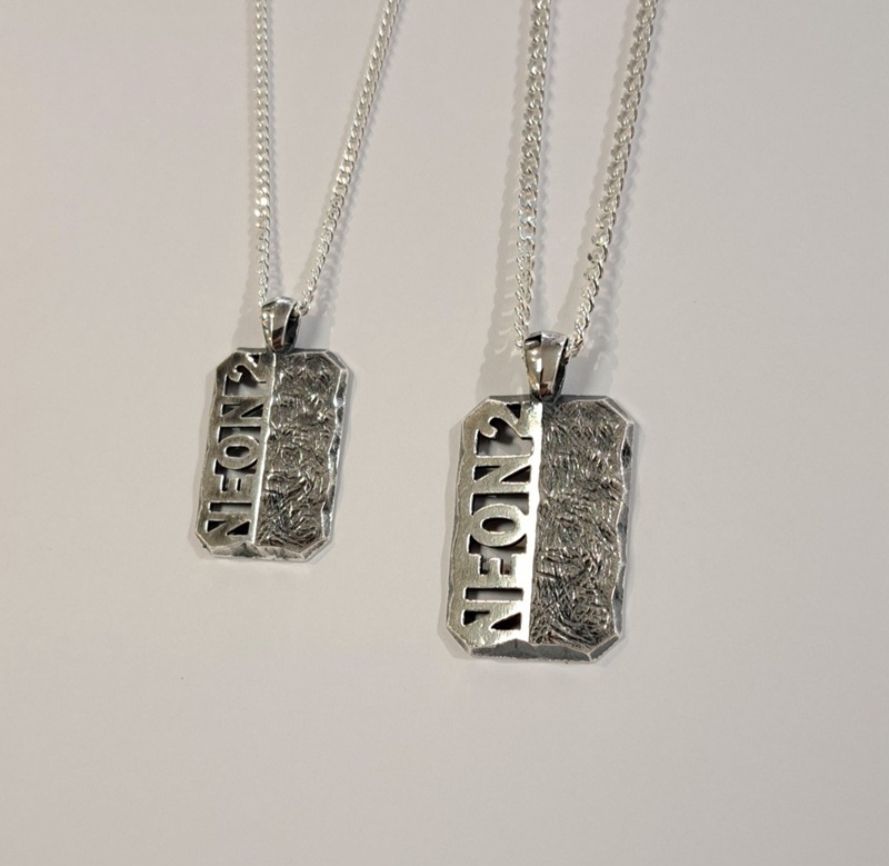 NEON2 Pieninä palasina laattakaulakoru, pienemmän laatan leveys n.15mm, korkeus n. 22,6mm, hopeaa, kotimaista työtä – Kirsi Helminen Design